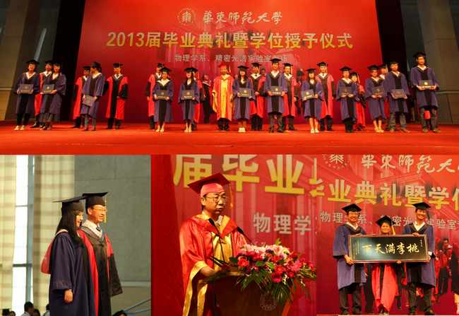 物理学系、精密光谱科学与技术国家重点实验室2013届毕业典礼暨学位授予仪式在《毕业歌》的歌声中落下帷幕,毕业生们带着自己的青春梦加入了实现中国梦的队伍,祝愿他们鹏程似锦,有空常回母校看看!