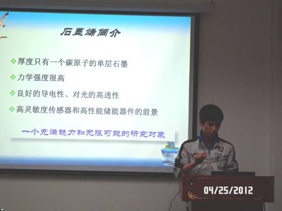 物理系于2012年4月25日在物理楼举行了2012年春季本科生科研训练项目中期汇报及结题答辩。本次汇报答辩会由热心指导本科生科研训练的教师代表毕志毅,宦强,管曙光,王加祥,阮建红,潘丽坤,陈丽清,张三军,张杰老师担任点评指导,分别在3个会场共19个课题组进行项目汇报。各位老师对选手的发 言进行了详尽的点评,并与学生进行了交流,不仅让学生们在学术研究方面有所收获,在整个进行的过程也提出了不少建议。其中老师们提出的:“不要只看重结 果,更要注重过程,要抱着兴趣去研究”建议让同学们印象深刻,老师们也说,在这个实验仪器完善、条件充足的环境下更应该好好珍惜,抓住研究机会。在报告会 结束之后,同学们也留下来自发的进行讨论,学术氛围非常良好,相信这次报告会不但让即将结题的同学们对自己的研究有了全新的认识和反思,对他们以后即将开 展的更长的一段研究之路也会有很大帮助。