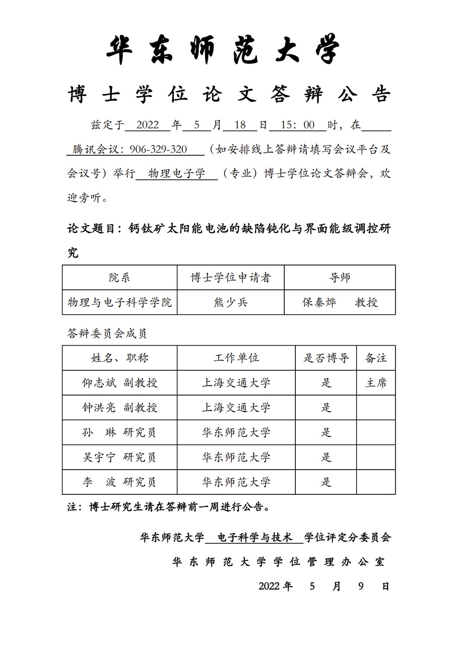 华东师范大学 博士学位论文答辩公告-熊少兵